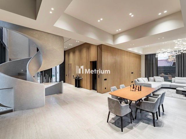Особенности дома: высокие потолки (4,2 м на 1-ом этаже и 3,1 м на втором), лестничный атриум высотой 7,5 м, панорамные окна с закаленным стеклом толщиной 10 мм, просторная терраса с барбекю-зоной, лифт, озелененные террасы с крупномерами и автополивом на 2-ом уровне.