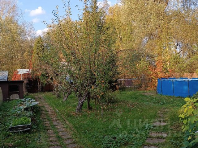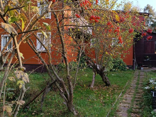 Сад и огород - туи, ели, сосны, 2 теплицы, грядки, яблони, груша, смородина, крыжовник, вишни, берёзы перед забором.