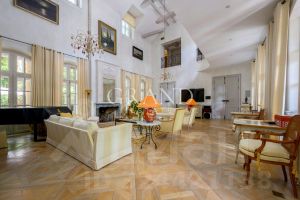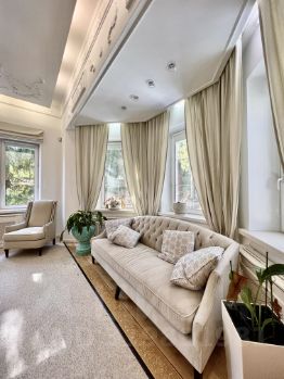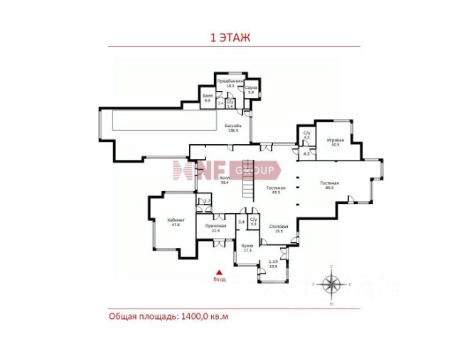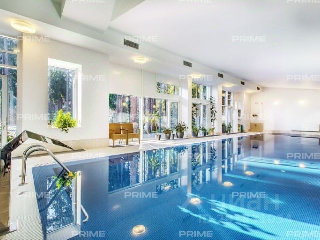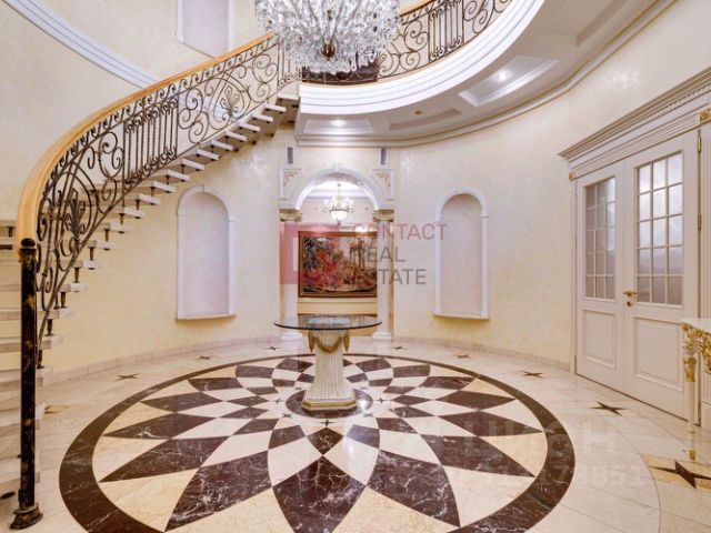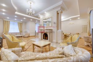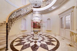 - Первый этаж: прихожая, кладовая, кабинет, санузел, кухня-столовая, гостиная с мраморным камином, терраса с подогреваемым полом, кладовая, котельная, прачечная, бассейн (8х4 м) с противотоком и выходом на участок, сауна, санузел и душевая, гараж на два авто.