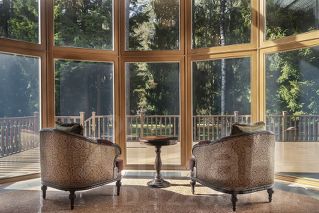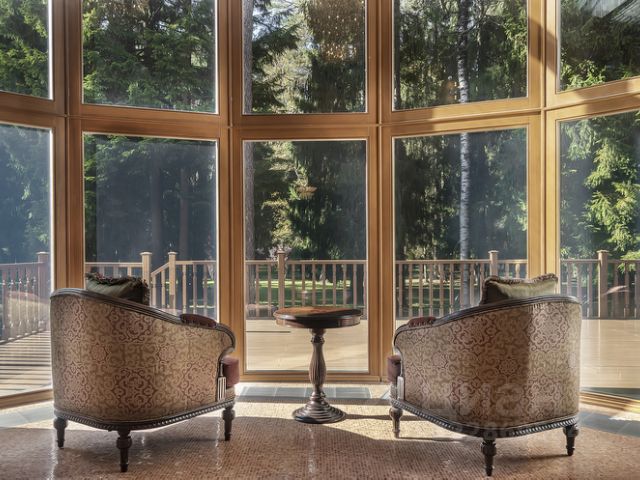 В интерьере использованы высококачественные материалы, такие как дерево, испанский керамогранит и мрамор. В доме предусмотрены теплые полы. Планировка включает спа-зону с бассейном (8 метров с противотоком), сауну и душевые, кабинет, просторную гостиную с камином, кухню-столовую с застекленной террасой, четыре спальни, пять ванных комнат и домашний кинотеатр с зоной отдыха.
