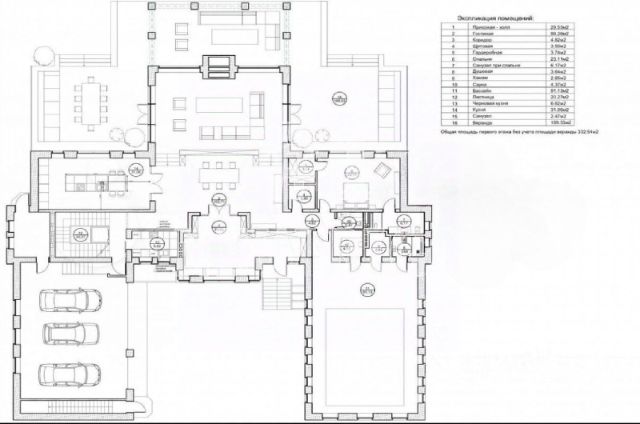 Лот 102904. Эксклюзив Vesco Realty. Коттеджный поселок "Рублевские горки" Резиденция площадью 2150 кв.м на участке 62 сотки расположена в 24 км от МКАД по Рублево-Успенскому шоссе в КП Рублевские горки. Удобный выезд на платную трассу. В доме: 5 спален, 2 гостиные, 3 кухни, 2 столовые зоны, кабинет с панорамным видом на 4 стороны, спа-комплекс с бассейном, сауной и хаммамом, винный погреб, гараж на 4 м/м, постирочная, балконы и террасы (442 кв.м). Фишки: лифт обычный и продуктовый, бассейн 15 метров (глубина от 1,2 до 2,2 метров), модный камин с поворотным механизмом на 360 градусов, второй свет в гостиной 7,6 м, снегогенератор. Особенности проекта: продуманная логистика, 2 автономных заезда на участок (на каждом - свой пункт охраны), уникальный рельеф, 2 участка для спорта и отдыха, 5 уровней в доме, котельная - в отдельном строении, собственная калитка в строящийся парк, вековые дубы на уличной террасе. На участке также расположен двухэтажный дом персонала площадью 214 кв.м. УЧАСТОК Дом стоит на рельефе, поэтому участок 62 сотки разделен на две части, примерно равные по площади - верхний уровень со входом на 1 этаж и нижний на -1 этаже с прямым доступом в спа-комплекс. С нижнего участка есть выход непосредственно в строящийся парк, который расположен на уровень ниже и не нарушает приватность жителей дома. На благоустроенной территории будут детские площадки, зоны отдыха, ландшафтное освещение, амфитеатр, терраса для занятий йогой, прогулочная тропа с деревянным настилом длиной более 1 км в одну сторону и даже искусственное озеро с пляжем. На верхнем уровне растут шикарные вековые дубы с пышными кронами. По периметру участков высажены туи и ели, оборудована зона барбекю и зона отдыха, система автополива, альпийская горка, подсветка дорожек. ПЛАНИРОВКИ -2 этаж: Винный погреб (25,2), лестница (25,5), с/у для персонала (5,6), постирочная (20,4). Технические помещения: электрощитовая (12,6), вент. камера (24,4),тех.помещение лифта (4,3), тех.помещение бассейна (13,1 + 38,4), коридор (90,2), подсобное помещение (1 + 6,2), лестницы (16,9 + 6). -1 этаж: Спа-комплекс: бассейн (188,9), сауна (6,6), хаммам (6,7), душевые (2,5 + 2,8), с/у (2,4), лестница (12,9), лифт, зона отдыха (73,4), терраса (159,3). Технические помещения: гараж (80,9), навес (33,9), комната охраны (18) с с/у (2,6), тепловой пункт (10,3). Помещение шеф-повара: техническая кухня (16,7), кладовая для продуктов (3,6), комната отдыха (17,3) с с/у (3,7), холл (10,3). 1 этаж: Тамбур (12,3), холл (18,2), гардеробная (10,7), гостевой с/у (3,4), гостиная 1 (146,5), столовая (37,8), кухня парадная (30,4), техническая кухня (8,6), гостиная 2 (28,2+7,28), лифт, террасы (167,1). Детский блок: коридор (24,6), спальня 1 (15,7) с ванной (4), спальня 2 (15,7) с ванной (4,3) и балконом (18,2), спальня 3 (33,5) с ванной (4,3) и балконом (77,4). 2 этаж: Мастер-блок: спальня (35,9) с балконом (15,3), ванной (25,3) c двумя с/у (2,3 + 2,3) и гардеробной (41,2), холл (14,7). Спальня 2 (33,9) с балконом (6), ванной (8,3) и гардеробной (9,9). Лестничный холл с зоной отдыха (102,1), лифт. 3 этаж: Гостиная 3 (32), кабинет (17,7), с/у (3,2), лифт (6), терраса (300). Дом охраны (214,2 кв.м). Квартира персонала: 3 спальни (20,1 + 19,9 + 18,9), кухня (10,4), душевая (5,7), с/у (3,1), коридор (23,5). Комната охраны (12) с с/у (3,1). Технические помещения: котельная (27,7), постирочная (4,9), гараж (36,2), техническое помещение (1,2), коридор (13,6). ФАСАД Травертин, канадский кедр. Светопрозрачные конструкции и раздвижки Schco. Кровля эксплуатируемая, частично с озеленением. МАТЕРИАЛЫ И БРЕНДЫ В отделке используется дерево, кр