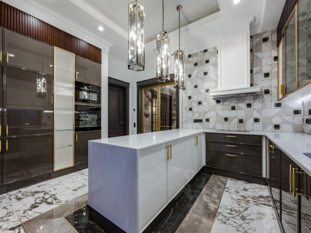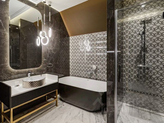 высокие потолки, высокие двери, сочетание натуральных материалов из камня, дерева, металла, различных систем и форм освещения, элементов декора современного и классического стиля, стильная современная и классическая мебель, лестница и полы отделка мрамор, массив, инженерная доска. Потолки лепнина. Вся мебель выполнена на заказ из дорогих материалов.