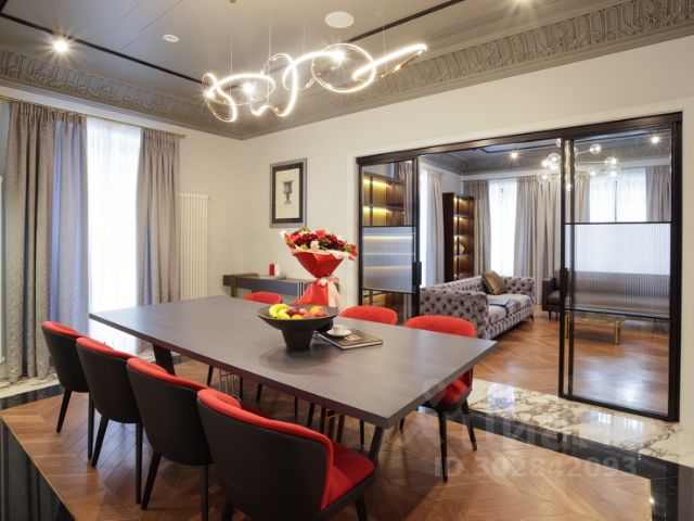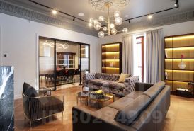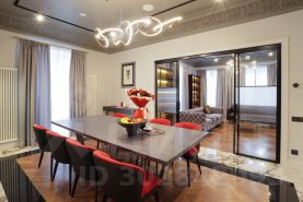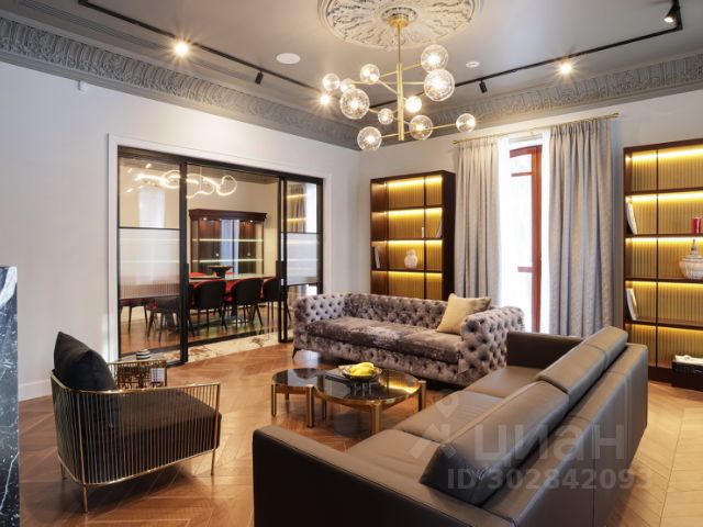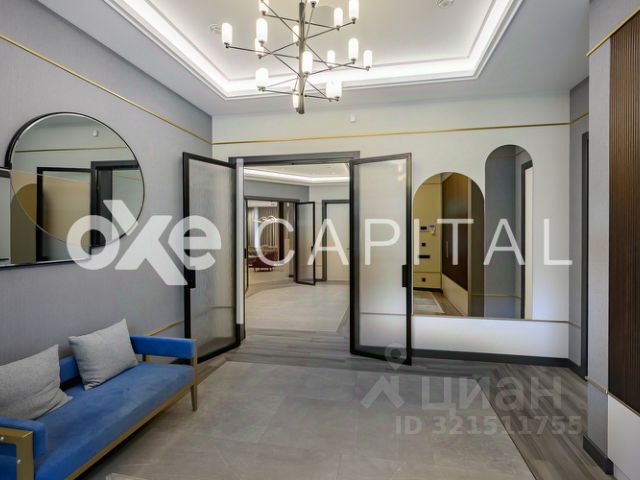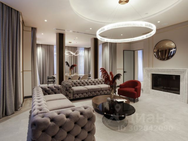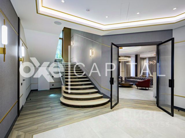 высокие потолки, высокие двери, гостиная со вторым светом, камин, сочетание натуральных материалов из камня, дерева, различных систем и форм освещения, элементов декора современного и классического стиля, стильная современная и классическая мебель, отделка лестницы и пола массив дуба, инженерная доска, отделка потолков лепнина, подоконники, камин, элементы с/у мрамор, вся мебель выполнена на заказ из дорогих материалов.