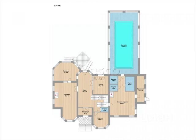 Прихожая (6,7), холл (46,8), гостиная (49,6), столовая с выходом в сад (27,4), кухня (18,4), гостевая спальня (18,5), гостевой с/у (2,2), спа-зона с комнатой отдыха (45,9), сауной (8,3), бассейном (119,4), душевой (2,8) и с/у (2,9), прихожая (11,5).