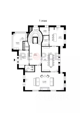 Этаж 1: прихожая, холл, кухня - столовая, гостиная, кабинет, гостевой с/у.