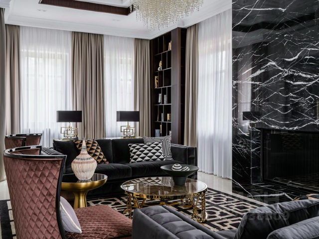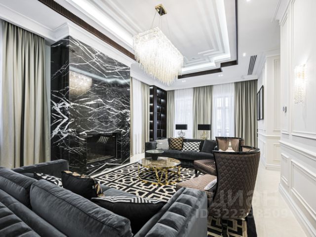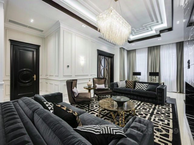 высокие потолки, высокие двери, сочетание натуральных материалов из камня, дерева, металла, различных систем и форм освещения, элементов декора современного и классического стиля, стильная современная и классическая мебель, лестница и полы отделка мрамор, массив, инженерная доска. Потолки лепнина. Вся мебель выполнена на заказ из дорогих материалов.