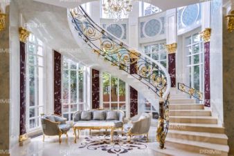 Планировка дома продумана до мелочей: просторный холл, несколько гардеробных и санузлов, каминный зал-столовая, основная и рабочие кухни с кладовыми, женский и мужской кабинеты (один из которых может служить спальней), отдельная зона для персонала с собственным входом, постирочная, бельевая, серверная, гараж на 3 машины и мастерская (имеет рядом санузел и можно сделать блок спальни). В жилой части — мастер-блок с будуаром, гардеробной, ванной и спальней, а также две детские спальни, каждая с гардеробной и с/у.