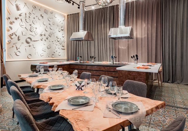 под руководством шеф-повара гости готовят 3 блюда, дегустируют их, а затем участвуют в анимационной и развлекательной программе — игры, танцы, интерактивы.