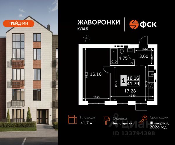 Прямая продажа от застройщика! Загородный жилой комплекс класса Комфорт Плюс. Продаётся 1-к квартира номер 25 общей площадью 41.79 кв.м на 3-м этаже 4 этажного дома. Без отделки. Особенности: - Квартира доступна к покупке в Trade-In. - Линейная планировка - максимальная функциональность и удобство. - Евроформат - просторное и удобное жилье с отличной планировкой. - Просторная кухня - место для семейных ужинов и кулинарных экспериментов. - Наличие острова на кухне - удобство и стиль для вашей кухни. - Ниша под шкаф - компактное и удобное место для вещей. - Вид из окна: двор - Просторная 1-комнатная квартира - Бесплатный трансфер до загородного поселка - 5 минут до МЦД-4 - Отличный вариант для проживания или инвестиций - Двухуровневая квартира - пространство и стиль в одном. - Своя благоустроенная набережная в поселке, - Престижная школа и детский сад на территории, - Закрытая территория и видеонаблюдение - Собственный парк вдоль набережной - Круглосуточная охрана - Зона с беседками и барбекю - Живописная река в пешей доступности - Квартиры с высокими потолками 7 м - Малоэтажный квартал у реки Квартиру можно приобрести с предчистовой (White box) и чистовой отделкой. Вам не придётся заниматься черновыми работами, а трудоемкий ремонт мы возьмем на себя! Расположение комплекса: Для создания гармоничного пространства в проекте собрана вся необходимая инфраструктура, начиная от закрытых дворов с детскими площадками и зонами отдыха, тренажерного спортивного зала с мини-саунами и детской комнаты, до благоустроенной набережной, где разместится большой игровой хаб с прогулочным маршрутом и зоной барбекю. Благоприятная роза ветров и отсутствие производств влияют на качество воздуха. Вода и природа успокаивают и заряжают энергией. В жилом комплексе "Жаворонки Клаб" создана современная образовательная среда с полным циклом обучения - от детского сада до старших классов. Школа 560 мест с инновационным оснащением. Детский сад 260 мест. Все образовательные учреждения будут муниципальными и записаться в них сможет каждый маленький житель комплекса. Дорога до школы или детского сада займет не более 5 минут. Ваш ребенок поспит подольше и не опоздает к первому уроку! Здесь также будет расположена муниципальная поликлиника, административно-бытовой комплекс, магазины и кафе. Транспортная доступность: В 30 м от территории ЖК находятся остановки общественного транспорта, откуда можно добраться до ближайших железнодорожных станций Санино (5 мин.), Крёкшино (7 мин.) и Жаворонки (7 мин.), а в 10 минутах - остановки маршрутов, идущих до станций метро Саларьево и Парк Победы. Съезд на Минское шоссе расположен в 700 м от ЖК. Внутренняя инфраструктура: В рамках проекта будут построены муниципальные детский сад и общеобразовательная школа, административно-бытовой комплекс (магазины формата "у дома", точки бытовых услуг, street-retail, кафе, кофейня, аптека, а также многофункциональный торгово-развлекательный центр с ФОК и амбулаторией. Для удобства и комфорта жителей, ко