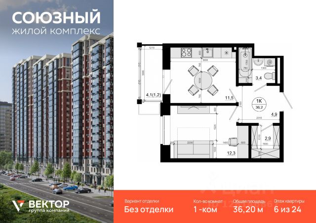 Продается 1-комн. квартира площадью 29,2 кв.м на 6 этаже 24 этажного дома в ЖК "Союзный" от федерального девелопера ГК "Вектор". ЖК Союзный Расположение, транспортная доступность Жилой комплекс "Союзный" - это квартал из 6 монолитных домов комфорт-класса высотой до 25 этажей, строящийся в 8-ом микрорайоне города Одинцово на улице Маковского. - 8 км от МКАД; - 15 минут пешком до станции "Одинцово" МЦД-1; - рядом находится автобусная остановка, от которой можно доехать до метро "Парк Победы", "Киевская", "Юго-Западная"; На личном автотранспорте доехать от комплекса по Минскому шоссе к новой развязке с МКАД можно примерно за 20 минут. В качестве альтернативы можно выбрать Можайское шоссе. Даже в час пик передвигаться по нему можно со скоростью 50 км/ч. Кроме того, можно выбрать платную трассу Северный обход Одинцово. Путь от квартала до Северо-Западной хорды на автомобиле займет 25-35 минут, а до ТТК и Садового кольца - 1 час. Инфраструктура В квартале запланировано строительство торгового центра, детского сада на 245 мест (сдача - 4 кв 2025 г.), многоуровневой открытой стоянки на 257 автомобилей, многоуровневого подземного паркинга, наземно-подземного паркинга с эксплуатируемой кровлей и других объектов. На внутренней территории квартала разместятся детский игровой комплекс с резиновым покрытием, спортплощадка, зоны отдыха для взрослых, деревья, кустарники и газоны. В шаговой доступности от ЖК "Союзный" располагаются школа, детский сад, профучилище, несколько ТЦ, кинотеатр "Юность", Ледовый дворец, сквер Союзный, Глазынинский пруд с качелями и площадкой для хоккея. В районе ЖК нет промышленных производств, а совсем близко начинаются лесные массивы, занимающие площадь свыше 70 000 га. Этот район считается одним из самых экологически чистых в Подмосковье. Надежность застройщика ГК "Вектор" - федеральный девелопер полного цикла. Группа компаний основана в 2014 году и сейчас занимает достойное место среди лидеров рынка недвижимости в топ-100 застройщиков. Портфель проектов составляет свыше миллиона квадратных метров жилья и инфраструктуры, включая жилые и коммерческие помещения, детские сады, а также рекреационные зоны в Подмосковье (4 жилых комплекса в Одинцовском районе) и Краснодарском крае. Вектор активно развивается на рынке девелопмента, сформировав команду профессионалов отрасли в составе более 300 человек. На данный момент более 80 тыс. кв.м. жилой площади в активной стадии строительства жилья. Застройщиком ЖК "Союзный" является компания "Стройтек", созданная в 2004 году и оказывающая строительно-монтажные услуги в Москве и Подмосковье. Приоритетные направления ее деятельности строительство, реконструкция и ремонт объектов недвижимости различного назначения. При этом, компания осуществляет весь цикл работ, обеспечивая не только качественное возведение жилых объектов, но и обустройство всей прилегающей к ним территории. Архитектура При проектировании фасадов зданий ЖК "Союзный" используются классические приемы реализации кирпичн