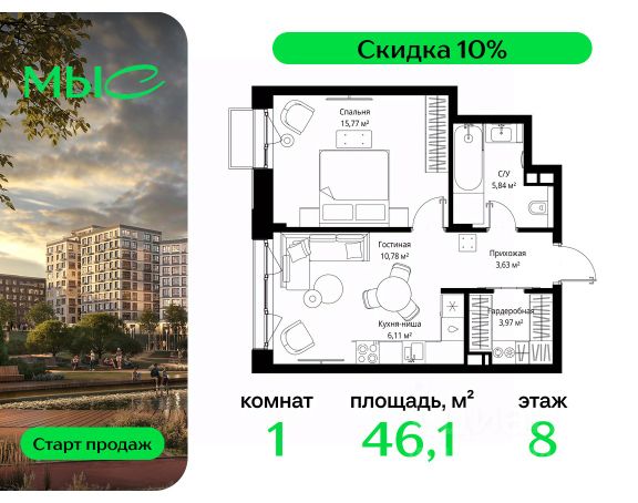 Прямая продажа от застройщика. Продаётся 3-комнатная квартира общей площадью 104.93 м² без отделки в премиальном жилом комплексе "МЫС" на 8-м этаже 12 этажного дома. Квартира расположена в корпусе "Сибирь". Проект МЫС — это, прежде всего, идеальное место для семей. В рамках проекта построят государственную школу, два детских сада и дворец спорта площадью 20 000 м2 с термальным комплексом, выплывным бассейном, фитнес-залом, теннисными, сквош и падел кортами и секциями для детей. На территории площадью, сравнимой с тремя парками Зарядье, появятся кафе и рестораны, пруд с набережной, спортивные и детские площадки, скейт-парк, лыжные и веломаршруты. Расположение: - 2 минуты до скоростной трассы М1 и Минского шоссе; - 10 минут до МКАД; - 15 минут до МЦД Лесной Городок - 20 минут до делового центра "Москва-Сити"; - 28 минут до аэропорта "Внуково". Благоустройство: - велосипедные и лыжные маршруты; - собственная набережная и парк; - лаунж-зоны в окружении природы; - беседки у очага; - дворец спорта площадью 20 000 м²; - термальный комплекс с тремя бассейнами; - 4 теннисных и падел-корта; - 6 сквош-кортов; - многофункциональный спортзал; - скейт-парк; - просторная площадь для прогулок с фонтаном; - детский клуб с творческими секциями; - гастро-доминанта; - кафе у пруда, рестораны, ритейл. Окружение - соседство с лесным фондом; - школа на 1250 мест и 2 детских сада на 350 и 255 мест; - Дубковский и Подушкинский леса, парк "Рассказовка", Мещерский парк. Действуют специальные условия при 100% оплате, подробности уточняйте у менеджера в офисе продаж.