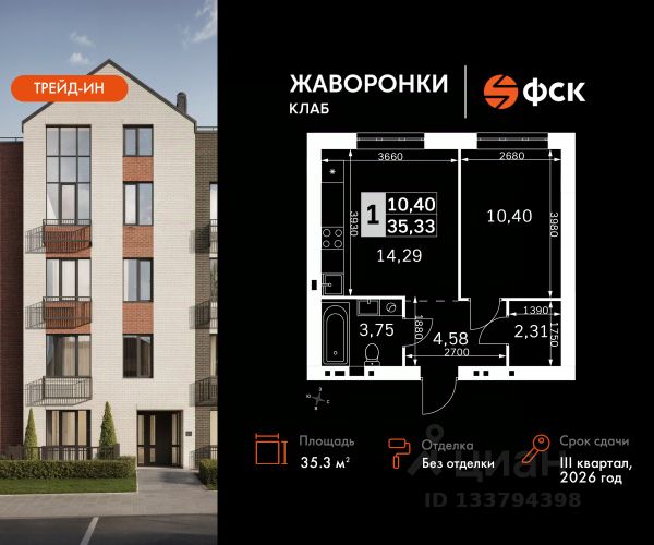Прямая продажа от застройщика! Загородный жилой комплекс класса Комфорт Плюс. Продаётся студия номер 119 общей площадью 29.03 кв.м на 2-м этаже 4 этажного дома. Без отделки. Особенности: - Квартира доступна к покупке в Trade-In. - Линейная планировка - максимальная функциональность и удобство. - Гардеробная - удобство для хранения и организации вещей. - Вид из окна: улица - Бесплатный трансфер до загородного поселка - 5 минут до МЦД-4 - Отличный вариант для проживания или инвестиций - Двухуровневая квартира - пространство и стиль в одном. - Своя благоустроенная набережная в поселке, - Престижная школа и детский сад на территории, - Закрытая территория и видеонаблюдение - Собственный парк вдоль набережной - Круглосуточная охрана - Зона с беседками и барбекю - Живописная река в пешей доступности - Квартиры с высокими потолками 7 м - Малоэтажный квартал у реки Квартиру можно приобрести с предчистовой (White box) и чистовой отделкой. Вам не придётся заниматься черновыми работами, а трудоемкий ремонт мы возьмем на себя! Расположение комплекса: Для создания гармоничного пространства в проекте собрана вся необходимая инфраструктура, начиная от закрытых дворов с детскими площадками и зонами отдыха, тренажерного спортивного зала с мини-саунами и детской комнаты, до благоустроенной набережной, где разместится большой игровой хаб с прогулочным маршрутом и зоной барбекю. Благоприятная роза ветров и отсутствие производств влияют на качество воздуха. Вода и природа успокаивают и заряжают энергией. В жилом комплексе "Жаворонки Клаб" создана современная образовательная среда с полным циклом обучения - от детского сада до старших классов. Школа 560 мест с инновационным оснащением. Детский сад 260 мест. Все образовательные учреждения будут муниципальными и записаться в них сможет каждый маленький житель комплекса. Дорога до школы или детского сада займет не более 5 минут. Ваш ребенок поспит подольше и не опоздает к первому уроку! Здесь также будет расположена муниципальная поликлиника, административно-бытовой комплекс, магазины и кафе. Транспортная доступность: В 30 м от территории ЖК находятся остановки общественного транспорта, откуда можно добраться до ближайших железнодорожных станций Санино (5 мин.), Крёкшино (7 мин.) и Жаворонки (7 мин.), а в 10 минутах - остановки маршрутов, идущих до станций метро Саларьево и Парк Победы. Съезд на Минское шоссе расположен в 700 м от ЖК. Внутренняя инфраструктура: В рамках проекта будут построены муниципальные детский сад и общеобразовательная школа, административно-бытовой комплекс (магазины формата "у дома", точки бытовых услуг, street-retail, кафе, кофейня, аптека, а также многофункциональный торгово-развлекательный центр с ФОК и амбулаторией. Для удобства и комфорта жителей, когда все "под рукой" мы разместили в ЖК бесплатный тренажерный зал с раздевалками и мини-саунами. Сюда можно приходить самостоятельно или с личным тренером для функциональной тренировки. Для детей обустроена игровая с множеством развивающих