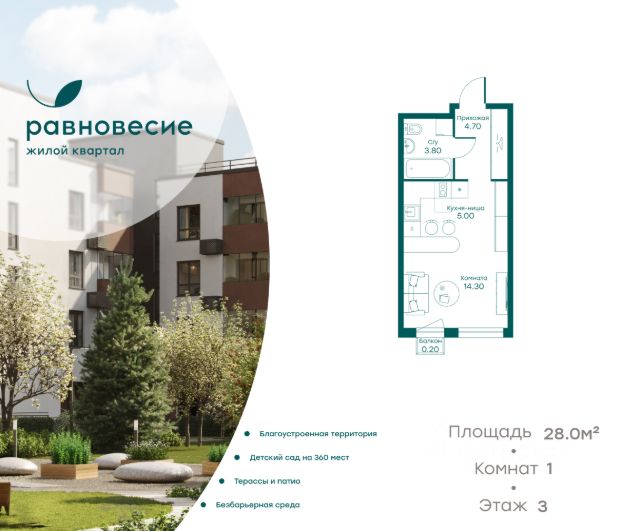Указанная акционная стоимость доступна при 100% оплате или ипотеке без субсидирования. Цена действует до 16.02.2026 23:59:00. Стоимость без акции 8321374. Продаётся квартира-студия общей площадью 27.80 кв. метров на 5 этаже жилого квартала комфорт-класса "Равновесие". На территории комплекса будет возведен детский сад на 360 мест, а на первых этажах жилых домов откроются кафе, магазины и все необходимое для удобства жителей. Локация "Равновесия" выделяется среди других пригородных ЖК разнообразием быстрых маршрутов до Москвы. Для автомобилистов преимуществом станут удобные выезды на Можайское шоссе, Рублёво-Успенское шоссе, Минское шоссе с платной трассой и другие. Также в пешей доступности находятся две ж/д станции — "Жаворонки" и "Здравница". Дорога на электропоезде до делового центра "Москва-Сити" составит всего 35 минут. Особенности ЖК: - Малоэтажная застройка: 4-6 этажей; - Благоустроенный пешеходный бульвар; - Пространства для отдыха и спорта; - Квартиры с террасами на последних этажах; - Квартиры с отдельным входом на первых этажах; - Внутренняя территория квартала свободна от машин; - Безбарьерная среда; - Помещения для хранения детских колясок и спортивного инвентаря.