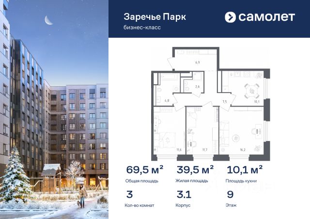 Строим кварталы для жизни с заботой о будущем. Предлагается 3-комнатная квартира бизнес-класса 69,5 кв.м в корпусе 3.1 на 9 этаже, в ЖК "Заречье Парк" Квартира с чистовой отделкой. Доступность дополнительных опций уточняйте у застройщика. Приобрести квартиру возможно по специальным акциям от застройщика, с текущими условиями акций можно ознакомиться в блоке "Акций". Цена динамическая и может отличаться, уточняйте актуальность у застройщика. "Заречье Парк" — жилой комплекс бизнес-класса рядом с Мещерским парком и инновационным центром "Сколково". Элитный квартал в голландском стиле создан по авторскому архитектурному проекту. Из окон открывается живописный вид на парк. Приватные дворы закрыты от машин, а на зеленой территории — разнообразные места для отдыха, игр и спорта. Жителям доступны своя поликлиника, школа и детский сад. Все квартиры — с готовой отделкой в нейтральной гамме.