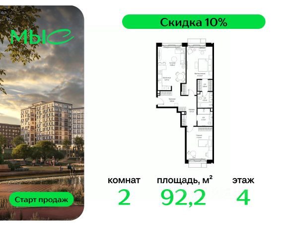 Прямая продажа от застройщика. Продаётся 3-комнатная квартира общей площадью 92.55 м² без отделки в премиальном жилом комплексе "МЫС" на 3-м этаже 12 этажного дома. Квартира расположена в корпусе "Сибирь". Проект МЫС — это, прежде всего, идеальное место для семей. В рамках проекта построят государственную школу, два детских сада и дворец спорта площадью 20 000 м2 с термальным комплексом, выплывным бассейном, фитнес-залом, теннисными, сквош и падел кортами и секциями для детей. На территории площадью, сравнимой с тремя парками Зарядье, появятся кафе и рестораны, пруд с набережной, спортивные и детские площадки, скейт-парк, лыжные и веломаршруты. Расположение: - 2 минуты до скоростной трассы М1 и Минского шоссе; - 10 минут до МКАД; - 15 минут до МЦД Лесной Городок - 20 минут до делового центра "Москва-Сити"; - 28 минут до аэропорта "Внуково". Благоустройство: - велосипедные и лыжные маршруты; - собственная набережная и парк; - лаунж-зоны в окружении природы; - беседки у очага; - дворец спорта площадью 20 000 м²; - термальный комплекс с тремя бассейнами; - 4 теннисных и падел-корта; - 6 сквош-кортов; - многофункциональный спортзал; - скейт-парк; - просторная площадь для прогулок с фонтаном; - детский клуб с творческими секциями; - гастро-доминанта; - кафе у пруда, рестораны, ритейл. Окружение - соседство с лесным фондом; - школа на 1250 мест и 2 детских сада на 350 и 255 мест; - Дубковский и Подушкинский леса, парк "Рассказовка", Мещерский парк. Действуют специальные условия при 100% оплате, подробности уточняйте у менеджера в офисе продаж.