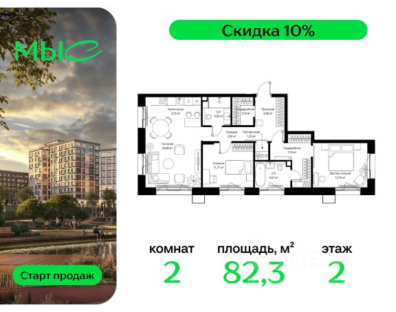 Прямая продажа от застройщика. Продаётся 2-комнатная квартира общей площадью 64.60 м² без отделки в премиальном жилом комплексе "МЫС" на 2-м этаже 12 этажного дома. Квартира расположена в корпусе "Волга". Проект МЫС — это, прежде всего, идеальное место для семей. В рамках проекта построят государственную школу, два детских сада и дворец спорта площадью 20 000 м2 с термальным комплексом, выплывным бассейном, фитнес-залом, теннисными, сквош и падел кортами и секциями для детей. На территории площадью, сравнимой с тремя парками Зарядье, появятся кафе и рестораны, пруд с набережной, спортивные и детские площадки, скейт-парк, лыжные и веломаршруты. Расположение: - 2 минуты до скоростной трассы М1 и Минского шоссе; - 10 минут до МКАД; - 15 минут до МЦД Лесной Городок - 20 минут до делового центра "Москва-Сити"; - 28 минут до аэропорта "Внуково". Благоустройство: - велосипедные и лыжные маршруты; - собственная набережная и парк; - лаунж-зоны в окружении природы; - беседки у очага; - дворец спорта площадью 20 000 м²; - термальный комплекс с тремя бассейнами; - 4 теннисных и падел-корта; - 6 сквош-кортов; - многофункциональный спортзал; - скейт-парк; - просторная площадь для прогулок с фонтаном; - детский клуб с творческими секциями; - гастро-доминанта; - кафе у пруда, рестораны, ритейл. Окружение - соседство с лесным фондом; - школа на 1250 мест и 2 детских сада на 350 и 255 мест; - Дубковский и Подушкинский леса, парк "Рассказовка", Мещерский парк. Действуют специальные условия при 100% оплате, подробности уточняйте у менеджера в офисе продаж. Купить квартиру в новостройке в городском округе Одинцовском Московской области.