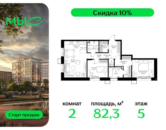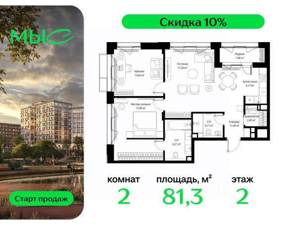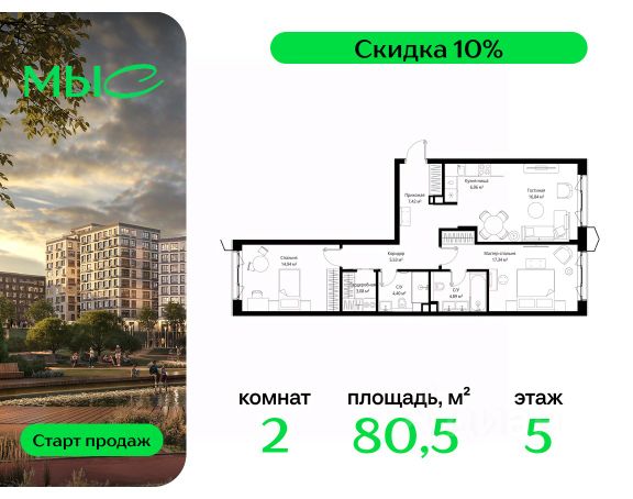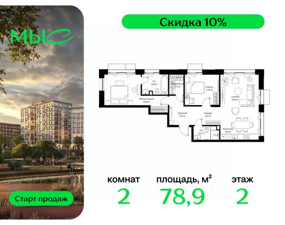 Прямая продажа от застройщика. Продаётся 2-комнатная квартира общей площадью 78.86 м² без отделки в премиальном жилом комплексе "МЫС" на 2-м этаже 12 этажного дома. Квартира расположена в корпусе "Волга". Проект МЫС — это, прежде всего, идеальное место для семей. В рамках проекта построят государственную школу, два детских сада и дворец спорта площадью 20 000 м2 с термальным комплексом, выплывным бассейном, фитнес-залом, теннисными, сквош и падел кортами и секциями для детей. На территории площадью, сравнимой с тремя парками Зарядье, появятся кафе и рестораны, пруд с набережной, спортивные и детские площадки, скейт-парк, лыжные и веломаршруты. Расположение: - 2 минуты до скоростной трассы М1 и Минского шоссе; - 10 минут до МКАД; - 15 минут до МЦД Лесной Городок - 20 минут до делового центра "Москва-Сити"; - 28 минут до аэропорта "Внуково". Благоустройство: - велосипедные и лыжные маршруты; - собственная набережная и парк; - лаунж-зоны в окружении природы; - беседки у очага; - дворец спорта площадью 20 000 м²; - термальный комплекс с тремя бассейнами; - 4 теннисных и падел-корта; - 6 сквош-кортов; - многофункциональный спортзал; - скейт-парк; - просторная площадь для прогулок с фонтаном; - детский клуб с творческими секциями; - гастро-доминанта; - кафе у пруда, рестораны, ритейл. Окружение - соседство с лесным фондом; - школа на 1250 мест и 2 детских сада на 350 и 255 мест; - Дубковский и Подушкинский леса, парк "Рассказовка", Мещерский парк. Действуют специальные условия при 100% оплате, подробности уточняйте у менеджера в офисе продаж.