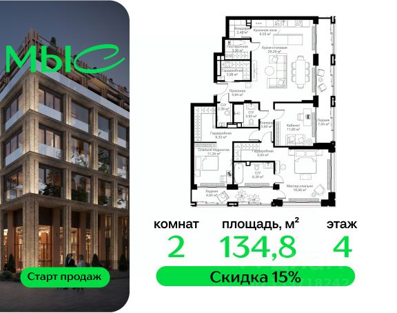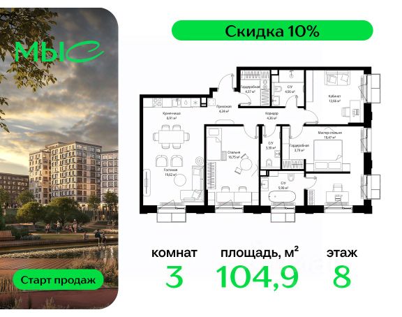 Прямая продажа от застройщика. Продаётся 3-комнатная квартира общей площадью 104.93 м² без отделки в премиальном жилом комплексе "МЫС" на 8-м этаже 12 этажного дома. Квартира расположена в корпусе "Сибирь". Проект МЫС — это, прежде всего, идеальное место для семей. В рамках проекта построят государственную школу, два детских сада и дворец спорта площадью 20 000 м2 с термальным комплексом, выплывным бассейном, фитнес-залом, теннисными, сквош и падел кортами и секциями для детей. На территории площадью, сравнимой с тремя парками Зарядье, появятся кафе и рестораны, пруд с набережной, спортивные и детские площадки, скейт-парк, лыжные и веломаршруты. Расположение: - 2 минуты до скоростной трассы М1 и Минского шоссе; - 10 минут до МКАД; - 15 минут до МЦД Лесной Городок - 20 минут до делового центра "Москва-Сити"; - 28 минут до аэропорта "Внуково". Благоустройство: - велосипедные и лыжные маршруты; - собственная набережная и парк; - лаунж-зоны в окружении природы; - беседки у очага; - дворец спорта площадью 20 000 м²; - термальный комплекс с тремя бассейнами; - 4 теннисных и падел-корта; - 6 сквош-кортов; - многофункциональный спортзал; - скейт-парк; - просторная площадь для прогулок с фонтаном; - детский клуб с творческими секциями; - гастро-доминанта; - кафе у пруда, рестораны, ритейл. Окружение - соседство с лесным фондом; - школа на 1250 мест и 2 детских сада на 350 и 255 мест; - Дубковский и Подушкинский леса, парк "Рассказовка", Мещерский парк. Действуют специальные условия при 100% оплате, подробности уточняйте у менеджера в офисе продаж. Купить квартиру в новостройке в городском округе Одинцовском Московской области.