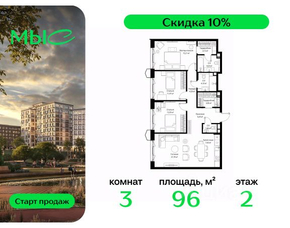 Прямая продажа от застройщика. Продаётся 3-комнатная квартира общей площадью 92.55 м² без отделки в премиальном жилом комплексе "МЫС" на 3-м этаже 12 этажного дома. Квартира расположена в корпусе "Сибирь". Проект МЫС — это, прежде всего, идеальное место для семей. В рамках проекта построят государственную школу, два детских сада и дворец спорта площадью 20 000 м2 с термальным комплексом, выплывным бассейном, фитнес-залом, теннисными, сквош и падел кортами и секциями для детей. На территории площадью, сравнимой с тремя парками Зарядье, появятся кафе и рестораны, пруд с набережной, спортивные и детские площадки, скейт-парк, лыжные и веломаршруты. Расположение: - 2 минуты до скоростной трассы М1 и Минского шоссе; - 10 минут до МКАД; - 15 минут до МЦД Лесной Городок - 20 минут до делового центра "Москва-Сити"; - 28 минут до аэропорта "Внуково". Благоустройство: - велосипедные и лыжные маршруты; - собственная набережная и парк; - лаунж-зоны в окружении природы; - беседки у очага; - дворец спорта площадью 20 000 м²; - термальный комплекс с тремя бассейнами; - 4 теннисных и падел-корта; - 6 сквош-кортов; - многофункциональный спортзал; - скейт-парк; - просторная площадь для прогулок с фонтаном; - детский клуб с творческими секциями; - гастро-доминанта; - кафе у пруда, рестораны, ритейл. Окружение - соседство с лесным фондом; - школа на 1250 мест и 2 детских сада на 350 и 255 мест; - Дубковский и Подушкинский леса, парк "Рассказовка", Мещерский парк. Действуют специальные условия при 100% оплате, подробности уточняйте у менеджера в офисе продаж.
