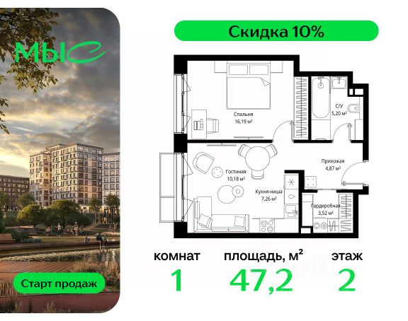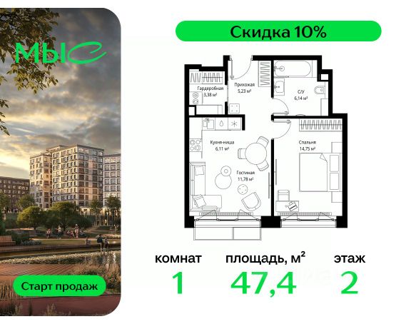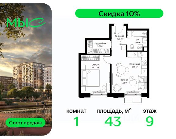 Прямая продажа от застройщика. Продаётся 1-комнатная квартира общей площадью 44.25 м² без отделки в премиальном жилом комплексе "МЫС" на 2-м этаже 12 этажного дома. Квартира расположена в корпусе "Волга". Проект МЫС — это, прежде всего, идеальное место для семей. В рамках проекта построят государственную школу, два детских сада и дворец спорта площадью 20 000 м2 с термальным комплексом, выплывным бассейном, фитнес-залом, теннисными, сквош и падел кортами и секциями для детей. На территории площадью, сравнимой с тремя парками Зарядье, появятся кафе и рестораны, пруд с набережной, спортивные и детские площадки, скейт-парк, лыжные и веломаршруты. Расположение: - 2 минуты до скоростной трассы М1 и Минского шоссе; - 10 минут до МКАД; - 15 минут до МЦД Лесной Городок - 20 минут до делового центра "Москва-Сити"; - 28 минут до аэропорта "Внуково". Благоустройство: - велосипедные и лыжные маршруты; - собственная набережная и парк; - лаунж-зоны в окружении природы; - беседки у очага; - дворец спорта площадью 20 000 м²; - термальный комплекс с тремя бассейнами; - 4 теннисных и падел-корта; - 6 сквош-кортов; - многофункциональный спортзал; - скейт-парк; - просторная площадь для прогулок с фонтаном; - детский клуб с творческими секциями; - гастро-доминанта; - кафе у пруда, рестораны, ритейл. Окружение - соседство с лесным фондом; - школа на 1250 мест и 2 детских сада на 350 и 255 мест; - Дубковский и Подушкинский леса, парк "Рассказовка", Мещерский парк. Действуют специальные условия при 100% оплате, подробности уточняйте у менеджера в офисе продаж.