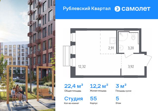 Строим кварталы для жизни с заботой о будущем. Предлагается квартира студия комфорт-класса 22,31 кв.м в корпусе 55 на 5 этаже, в ЖК "Рублевский Квартал" Квартира без отделки. Доступность опции "отделка" и возможность комплектации мебелью и декором уточняйте у застройщика. Приобрести квартиру возможно по специальным акциям от застройщика, с текущими условиями акций можно ознакомиться в блоке "Акций". Цена динамическая и может отличаться, уточняйте актуальность у застройщика. Жилой комплекс "Рублевский Квартал" на западе Москвы окружен Подушкинским и Дубковским лесами. Рядом ж/д станция Усово и МЦД-1 "Одинцово". На территории комплекса — школа, детский сад, поликлиника и торговый центр. Архитектура с переменной этажностью от 3 до 12 этажей гармонично вписывается в природу. Закрытый двор-парк, кленовые аллеи и игровые зоны создают уют. Квартиры с отделкой и живописными видами на лес.