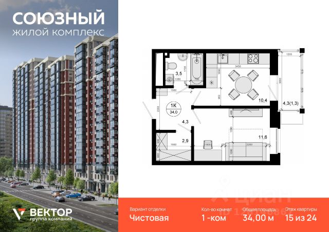 Продается 1-комн. квартира площадью 42,3 кв.м на 15 этаже 21 этажного дома в ЖК "Союзный" от федерального девелопера ГК "Вектор". Расположение, транспортная доступность Жилой комплекс "Союзный" — это квартал из 6 монолитных домов комфорт-класса высотой до 25 этажей, строящийся в 8-ом микрорайоне города Одинцово на улице Маковского. В продаже квартиры площадью от 37,2 до 88 кв. м, с потолками высотой 2,7 м, лоджиями, 2-мя санузлами в квартирах с 3-мя комнатами. Квартиры без отделки и с отделкой эконом, бизнес или комфорт класса. Квартал располагается на территории с отличной транспортной доступностью: - 8 км от МКАД; - 15 минут пешком до станции "Одинцово" МЦД-1; - рядом находится автобусная остановка, от которой можно доехать до метро "Парк Победы", "Киевская", "Юго-Западная"; На личном автотранспорте доехать от комплекса по Минскому шоссе к новой развязке с МКАД можно примерно за 20 минут. В качестве альтернативы можно выбрать Можайское шоссе. Даже в час пик передвигаться по нему можно со скоростью 50 км/ч. Кроме того, можно выбрать платную трассу Северный обход Одинцово. Путь от квартала до Северо-Западной хорды на автомобиле займет 25-35 минут, а до ТТК и Садового кольца - 1 час. В квартале запланировано строительство торгового центра, детского сада на 245 мест (сдача - 4 кв 2025 г.), многоуровневой открытой стоянки на 257 автомобилей, многоуровневого подземного паркинга, наземно-подземного паркинга с эксплуатируемой кровлей и других объектов. На внутренней территории квартала разместятся детский игровой комплекс с резиновым покрытием, спортплощадка, зоны отдыха для взрослых, деревья, кустарники и газоны. В шаговой доступности от ЖК "Союзный" располагаются школа, детский сад, профучилище, несколько ТЦ, кинотеатр "Юность", Ледовый дворец, сквер Союзный, Глазынинский пруд с качелями и площадкой для хоккея. В районе ЖК нет промышленных производств, а совсем близко начинаются лесные массивы, занимающие площадь свыше 70 000 га. Этот район считается одним из самых экологически чистых в Подмосковье.* Продается квартира квартир в Союзный в Одинцово.