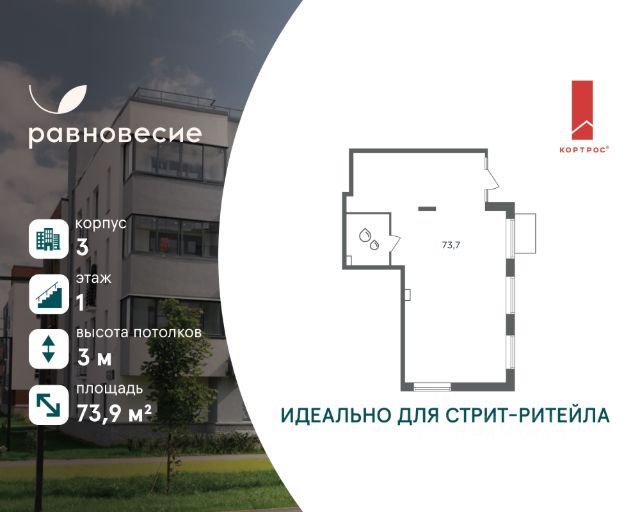 Продаётся коммерческое помещение на 1-м этаже ЖК комфорт-класса "Равновесие" ОТ ЗАСТРОЙЩИКА общей площадью 73,70 кв.м и стоимостью 16951000 рублей.
