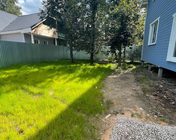 —забор из профлиста, откатные ворота 4,85 м, въездная группа выложена дорожными плитами. Забор по всему периметру участка.
