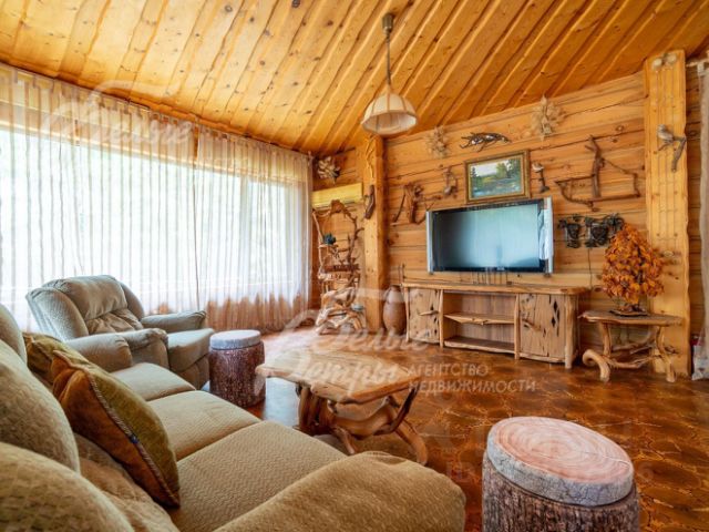 Описание внутренней отделки: внутренняя отделка дома выполнена в лучших традициях русского зодчества из ценных пород дерева, бересты каждая деталь привлекает внимание: изящные наличники, эффектные потолочные карнизы, мебель и декор, созданные мастерами вручную. Стены отделаны эстетичным кедровым лафетом, между венцами проложен канат. На первом этаже уложен оригинальный наборный пол из спилов различных пород дерева, в спальнях инженерная доска. Потолок выполнен из массива лиственницы. В гостиной потолок из кедра в виде лучей без единого стыка. Установлены межкомнатные двери из кедра, входные двери со световыми окнами, декорированные снаружи корой дерева. Интерьер дополняют выключатели в стиле "ретро" (разводка наружная, открытая), пейзажная живопись, столики и тумбы из древесных ветвей. На верхние этажи ведут деревянные лестницы с художественным исполнением ограждения из веток и стволов дерева. На первом этаже и в санузлах тёплые полы, интегрированы внутрипольные конвекторы Mohlenhoff с принудительной конвекцией. Пол террасы выложен архитектурным бетоном с имитацией среза пенька с заполнением промежутков по технологии "каменный ковер".