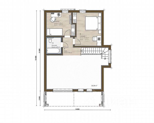 Две спальни, кухня столовая, гостиная. Бонус! над спальнями две антресоли по 9 кв.м с окнами, можно использовать как спальные места, игровые комнаты. Внутренняя отделка Вологодская вагонка "Штиль" сорт А/Б, пол ламинат, двери.