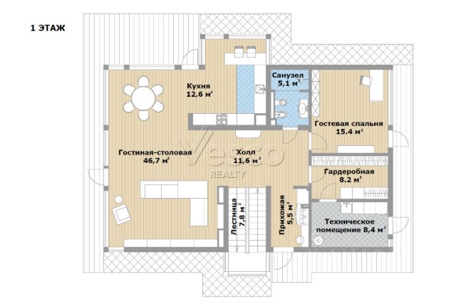 Столовая-гостиная также полностью укомплектована стильной мебелью в натуральном шпоне. Безопасные энергосберегающие просветленные стеклопакеты с теплой дистанционной планкой и заполнением аргоном. Двери Schco (Германия).