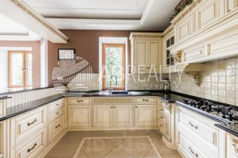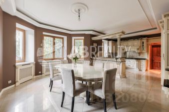 Лот: 9917440. ЭКСКЛЮЗИВ NF GROUP. Дом с мебелью 440 кв.м на участке 16.3 cот. Кол-во спален: 4. Кол-во с/у: 5. Поселок "Сосновый бор". Рублево-Успенское шоссе, 24 км от МКАД. Без комиссии для покупателя. Двухэтажный загородный дом в современном стиле площадью 440 м² и отдельный СПА-блок расположены на лесном участке 16 соток. Фасад главного дома облицован серо-синим клинкером. 1 этаж: гостиная, кухня, столовая, комната для персонала-постирочная, терраса, выход на придомовую территорию, гараж на два автомобиля; 2 этаж: спальня родителей, две гардеробные зоны, ванная комната, гостевая спальня, ванная комната, детский блок спальня, комната для няни с душем, кухня для детей, собственный вход с первого этажа. На участке с соснами провели ландшафтные работы, установили детскую площадку и построили отдельную бревенчатую баню с комнатой отдыха. Машину можно оставить в двойном закрытом гараже в доме, или на участке около ворот. В 24 км от МКАД по Рублево-Успенскому шоссе, на Николиной Горе, в экологически чистом районе, расположен охраняемый коттеджный поселок "Сосновый бор". Поселок обеспечен всеми центральными коммуникациями, в дома проведен высокоскоростной интернет. В пешей доступности находится пансионат "Сocны": СПА, теннисные корты, бассейн. Загородная недвижимость в поселке Николина Гора Московской области.