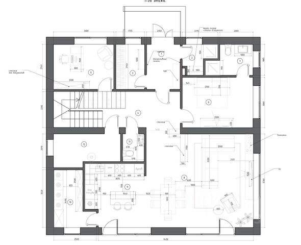 1-й этаж: прихожая, гардеробная, кухня-столовая с выходом на террасу с 15-и метровыми елями и зоной барбекю, каминный зал со 2-м светом, спальня с ванной комнатой, кабинет, гостевой санузел, SPA-зона (бассейн с противотоком, сауна, санузел с душем, комната отдыха).