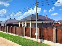 Дом имеет площадь 1100 квадратных метров и расположен на огромном участке в 3500 квадратных метров, где вы сможете наслаждаться живописной природой, свежим воздухом и тишиной. Ландшафтный дизайн сотворен по проекту известного бюро. Озеленение выполнено с использованием элитных видов растений. Гармоничная уличная подсветка. На участке свои сосны. В недоступности от чужих глаз установлено уличное джакузи. Своя теплица. Цельнометаллический забор с художественной ковкой. Такой же забор установлен в центре Москвы у одного из памятников архитектуры. Домик для персонала объеденный с гаражом: три машиноместа с кладовкой на первом этаже и двумя спальнями, кухней, санузлом на втором этаже.