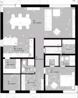1 этаж: 2 гардеробные, 2 кабинета, 2 с/у, бассейн, выход на участок, гостиная и зимний сад с камином, душ, зона ТВ, кухня и столовая, холл