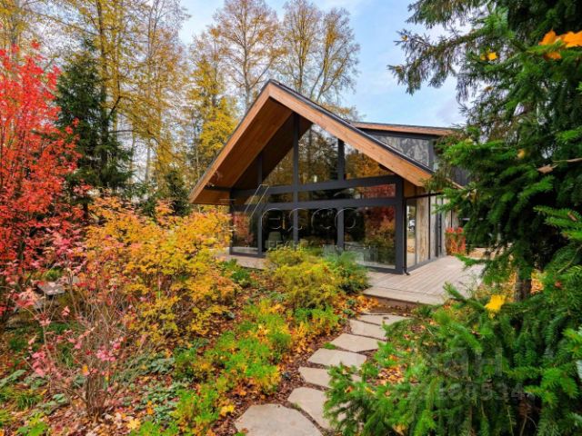 Уютный фахверк для постоянного проживания в скандинавском стиле с большим панорамным остеклением на лесном благоустроенном участке 20 соток в 50 км от МКАД по Новорижскому шоссе (30 минут в пути) в коттеджном поселке Новолеоново.