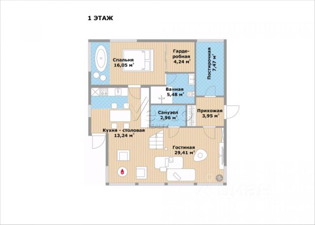 1 этаж: прихожая (4), кухня-столовая (13,2), гостиная (29,4), гостевой с/у (3), спальня (16,1) с гардеробной (4,2) и ванной комнатой (5,5), постирочная (7,5), терраса.