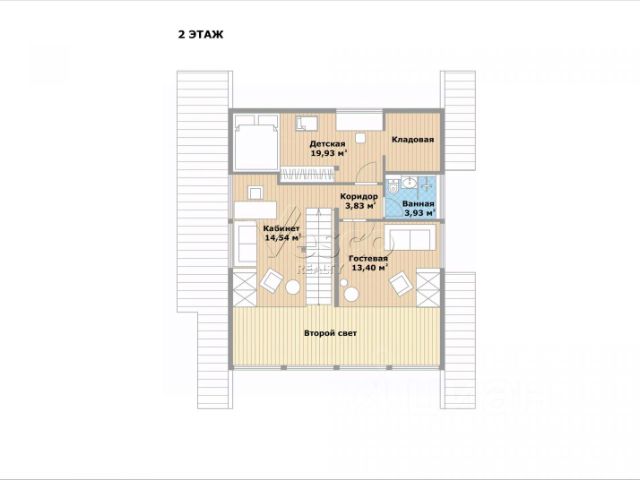 2 этаж: детская (20), кладовая, гостевая спальня (13,4), с/у (3,9), кабинет (14,5), коридор (3,8), второй свет.