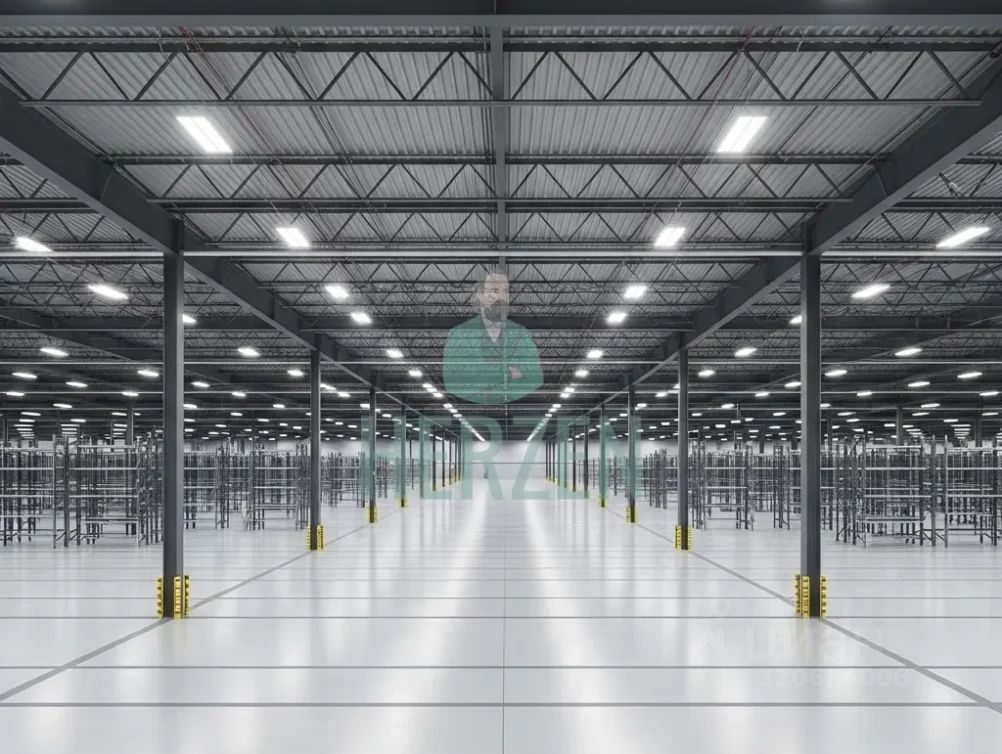 Ровный бетонный пол с антипылевым покрытием. Допустимая нагрузка на пол 7 т/м2.