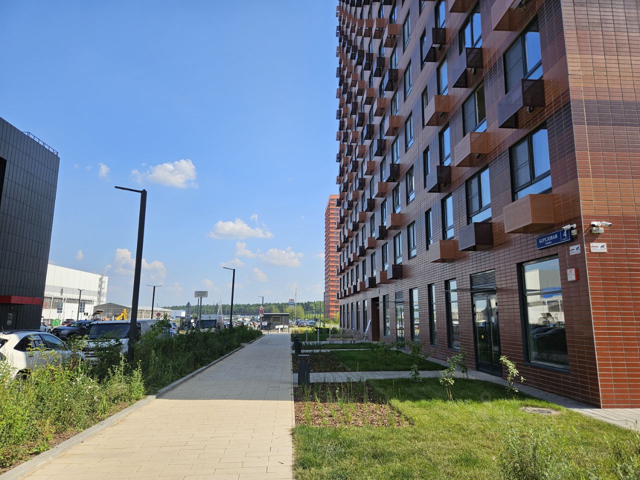 Напротив расположена наземная многоуровневая парковка.