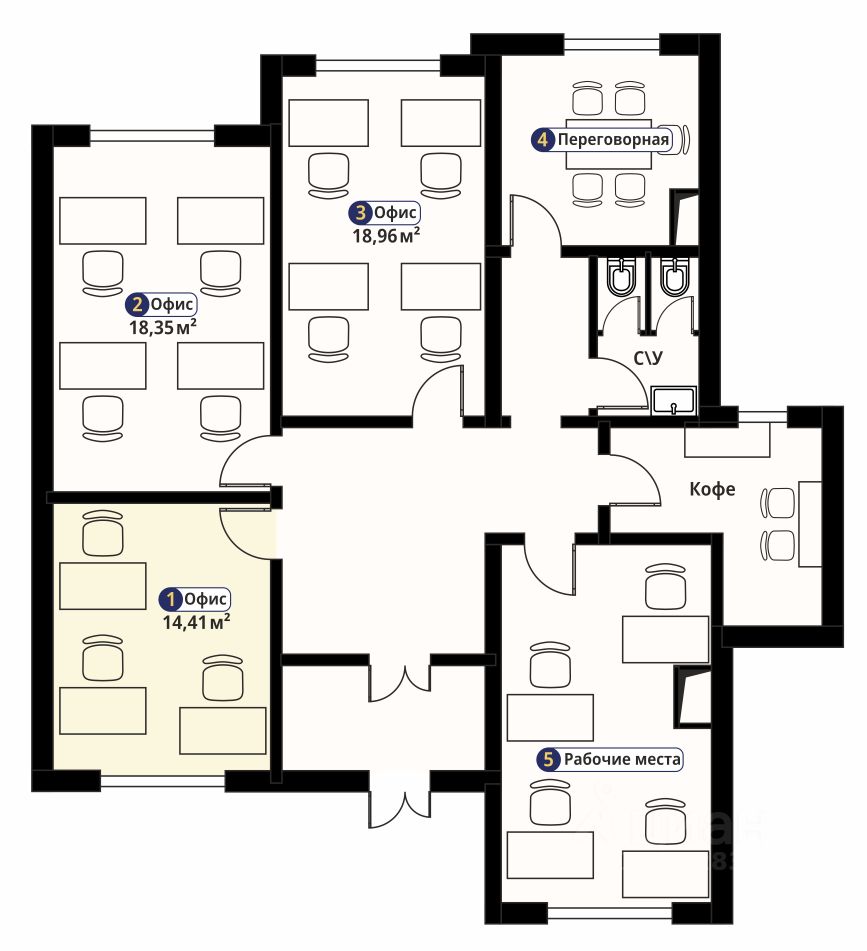 • Идеальный размер: Площадь 14.41 м² отлично подходит для комфортной работы команды специалистов.