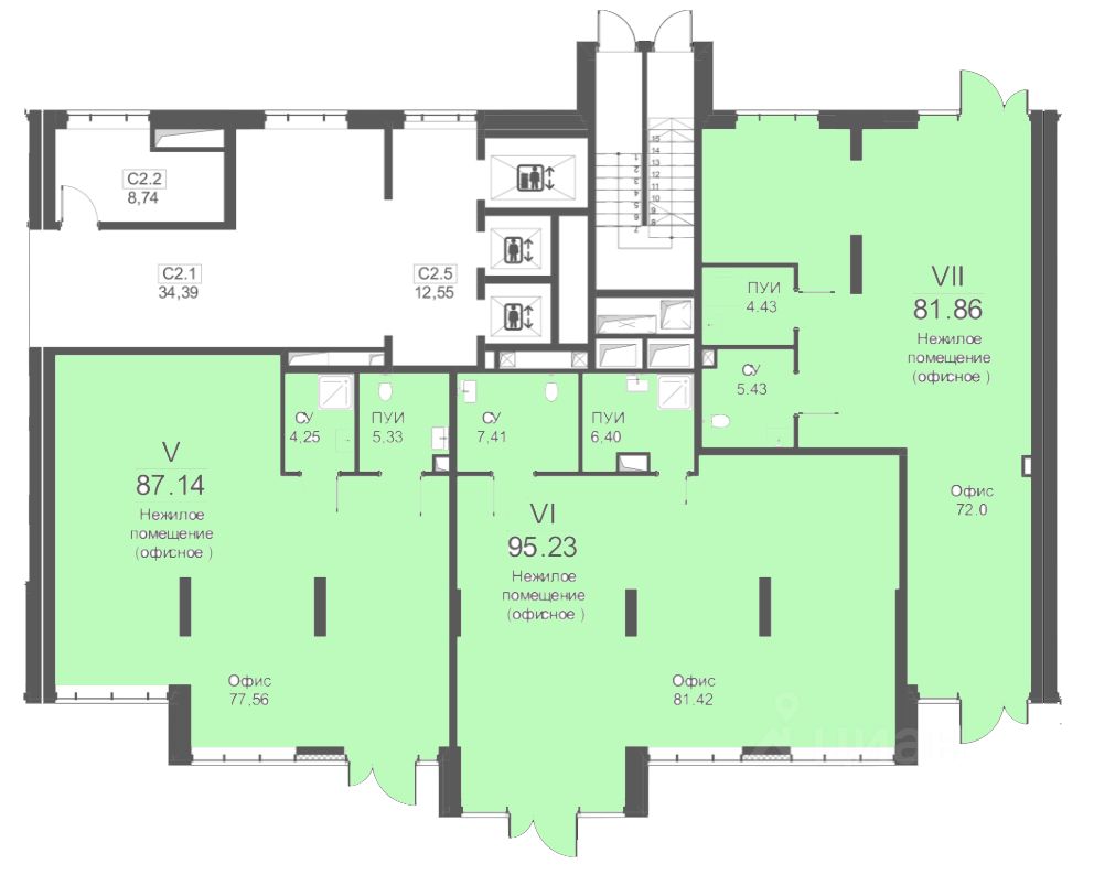 • Площади: 69,18 м²; 81,86 м²; 87,14 м²; 94,97 м²; 95,23 м² (объединяются до 150180 м²).