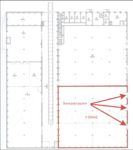 Зона разгрузки: 3 отдельных зоны с габаритами ворот - Ш 2,62м х В 2,90м.