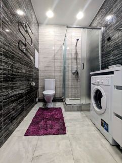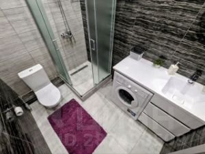 Совмещенный санузел с душевой кабиной и стиральной машиной.