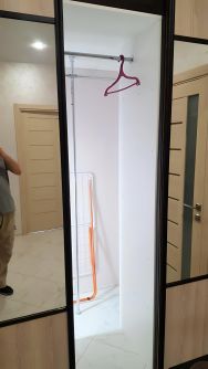 Два шкафа купе глубиной 1 и 1,2 метра во всю высоту от пола до потолка. Проблем с размещением вещей не будет. Спальня просторная, при перемещении мебели позволит разместить и детскую кровать.