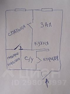 Помещения: 1. Санузел, 2. коридор, 3. кухня-зал, 4. спальня, 5. гардеробная.