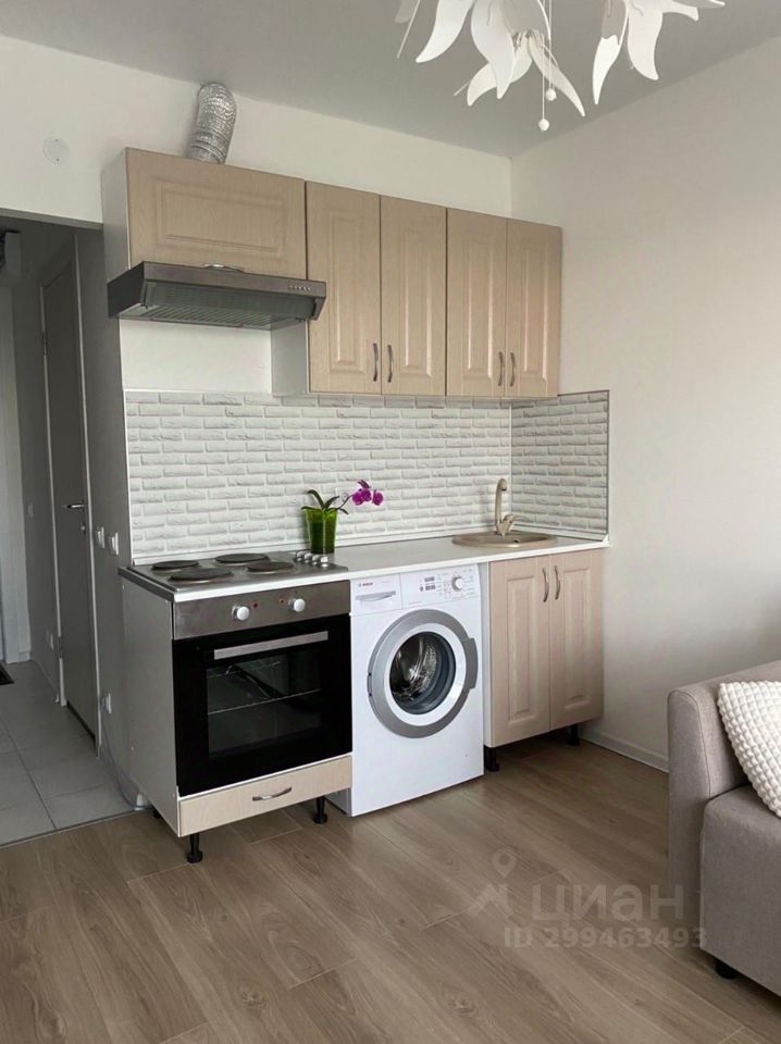 Студия оснащена кухонным гарнитуром, необходимой мебелью и техникой, есть стиральная машина, плита, холодильник с морозильной камерой, принтер, три шкафа. Коммунальные платежи не входят в ежемесячную плату.