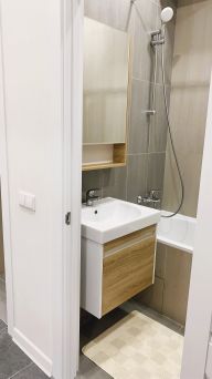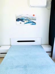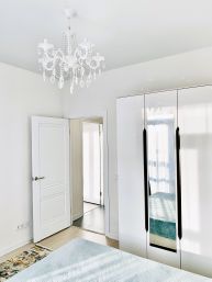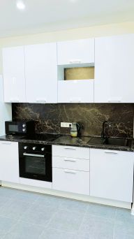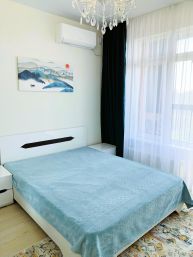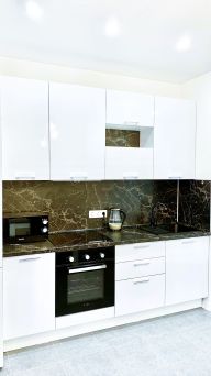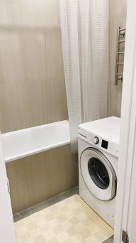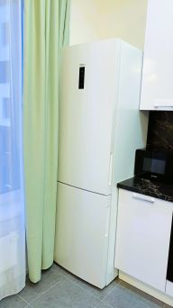 Из техники: 2-метровый вместительный холодильник Haier, варочная панель, духовой шкаф, встроенная вытяжка, микроволновка, чайник, стиральная машина, телевизор Haier с 4К изображением, кондиционер премиум класса Shivaki. Также имеется сушилка для белья, гладильная доска, утюг.