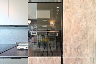 В кухонную мебель встроена немецкая техника, в добавок к стандартному набору техники в квартирах премиального уровня, еще есть винный шкаф и кофемашина.
