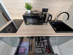 Плита, холодильник, микроволновая печь, чайник, набор посуды;